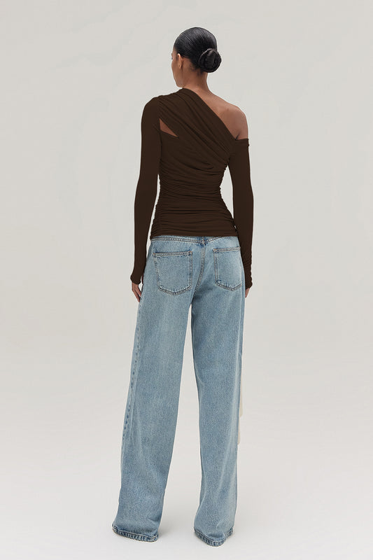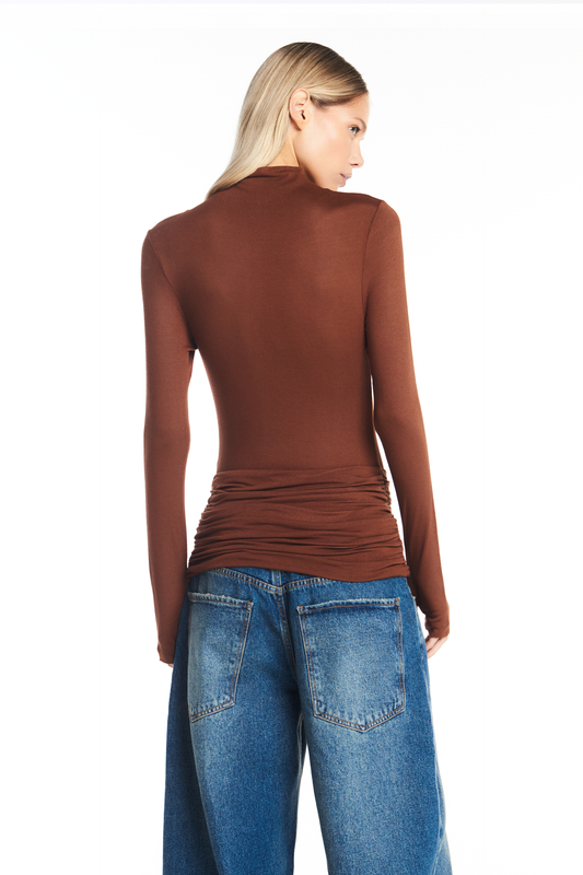EsgotadoBLUSA MANGA LONGA GOLA ALTA FAIXA DRAPEADA QUADRIL MALHA MARROM