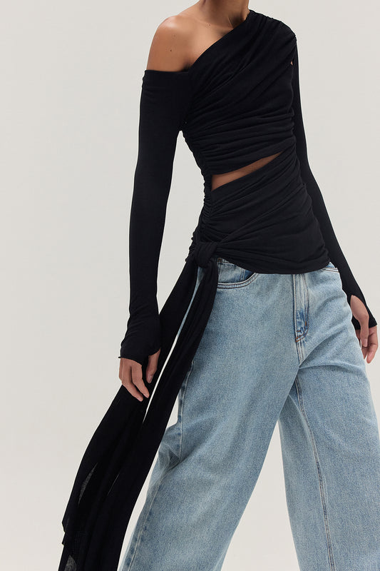 EsgotadoBLUSA MANGA LONGA GOLA ALTA FAIXA DRAPEADA QUADRIL MALHA PRETA