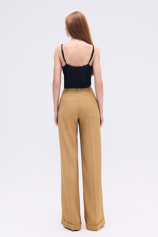 CALÇA ALFAIATARIA BARRA ITALIANA CREPE PATOU RISCA DE GIZ CARAMELO