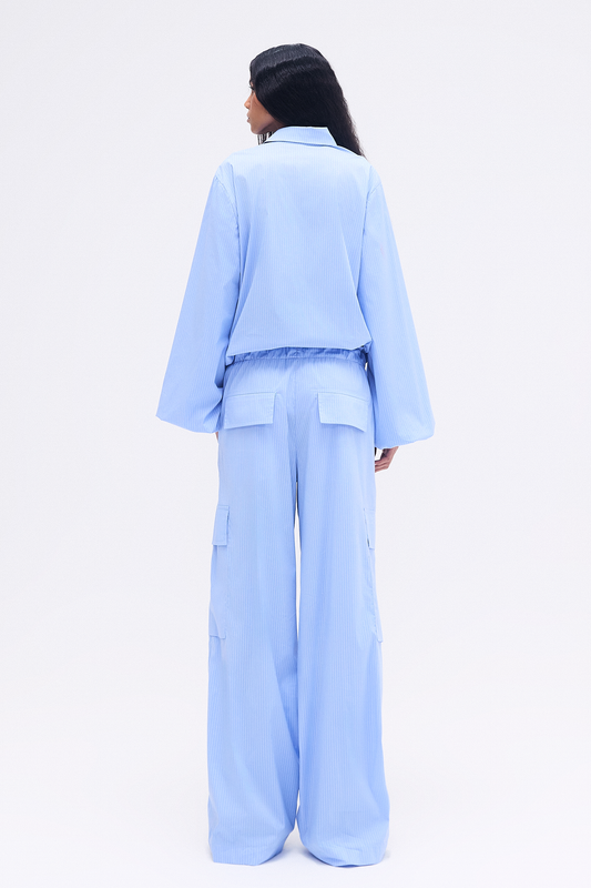 EsgotadoCALÇA CARGO ELÁSTICO CÓS TRICOLINE LISTRAS AZUIS