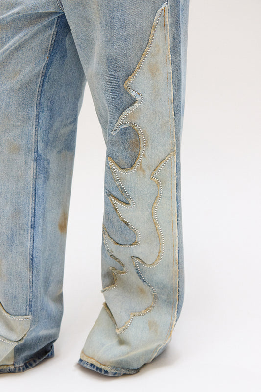 EsgotadoCALÇA JEANS APLICAÇÃO FOGO