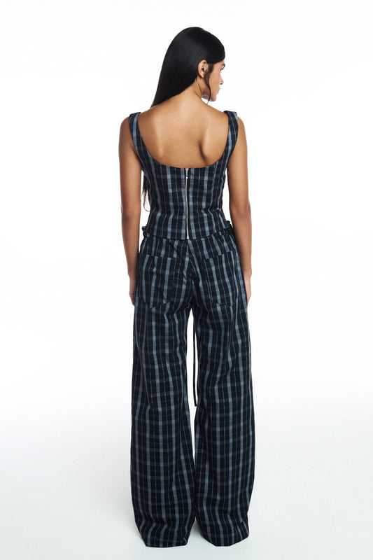 CALÇA ELÁSTICO CÓS LINHO XADREZ AZUL E BEGE