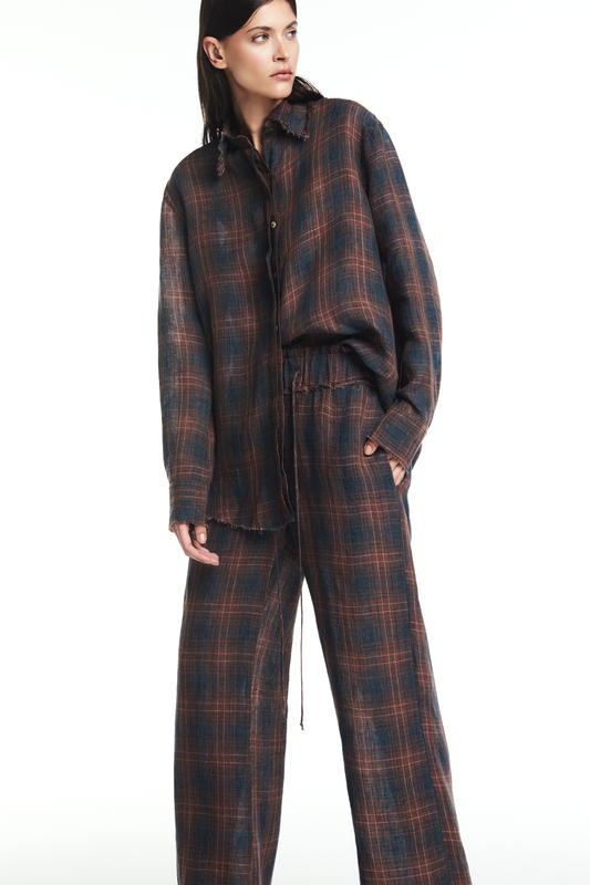 CALÇA ELÁSTICO CÓS LINHO XADREZ AZUL E VINHO