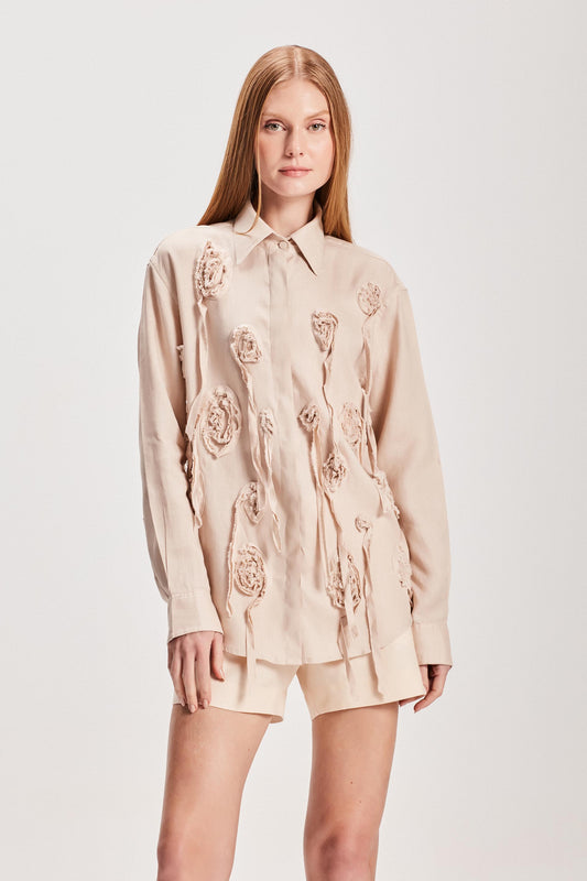 EsgotadoCAMISA LINHO FLORES APLICADAS BEGE