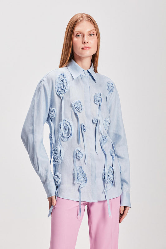 EsgotadoCAMISA LINHO FLORES APLICADAS AZUL