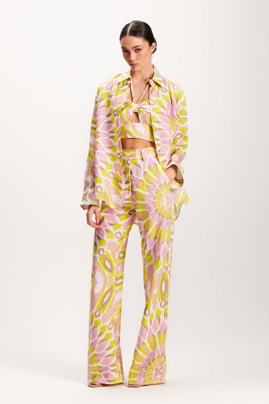 EsgotadoCAMISA LINHO ESTAMPA MANDALA VERDE E ROSA