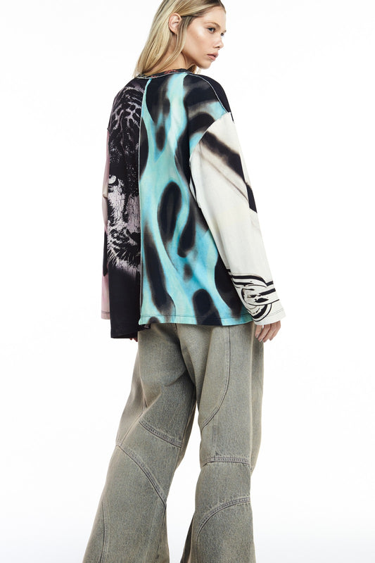 CAMISETA MANGA LONGA PATCHWORK ESTAMPAS MALHA