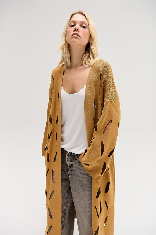 EsgotadoCARDIGAN TRICOT LONGO FUROS CARAMELO