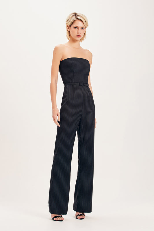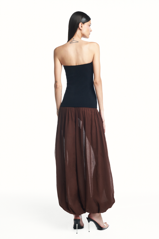 MACACÃO TOMARA QUE CAIA CORPO MALHA PRETA CALÇA ALGODÃO MARROM