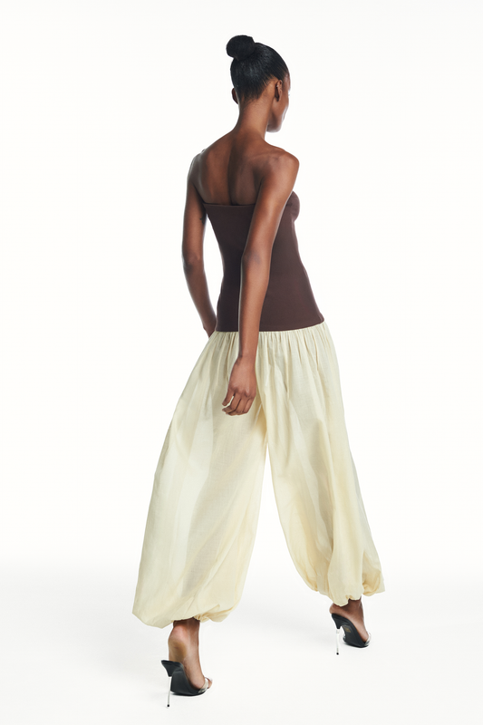 MACACÃO TOMARA QUE CAIA CORPO MALHA MARROM CALÇA ALGODÃO MANTEIGA