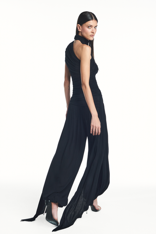 EsgotadoMINI SAIA ASSIMÉTRICA DRAPEADA PONTAS MALHA PRETA