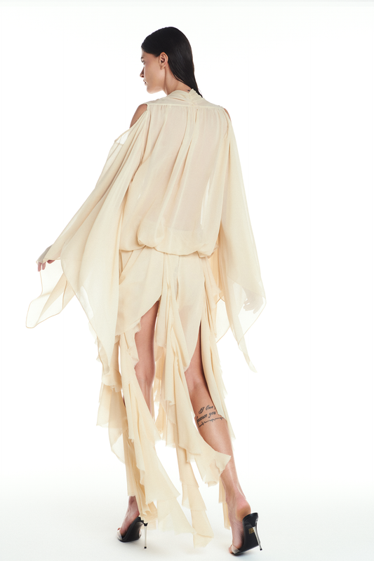 MACAQUINHO COM CAPA BABADOS BARRA E MANGAS GEORGETE MANTEIGA