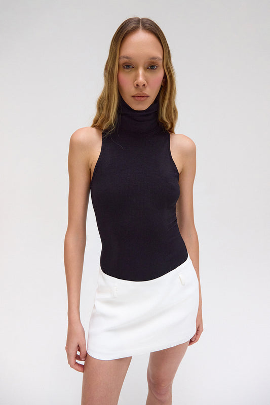 MINI SHORTS SAIA ALFAIATARIA CREPE PATOU RISCA DE GIZ PRETO