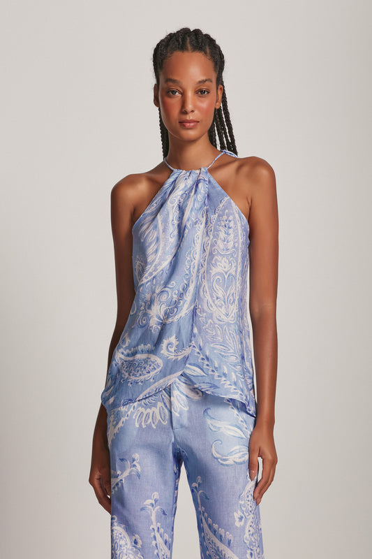 EsgotadoREGATA TRANSPASSADA LINHO ESTAMPA PAISLEY AZUL