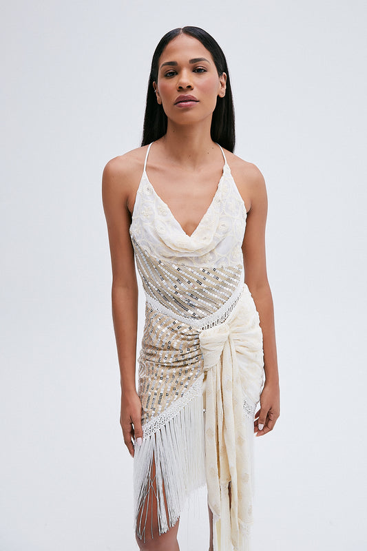 EsgotadoREGATA PATCHWORK COM FRANJA OFF WHITE