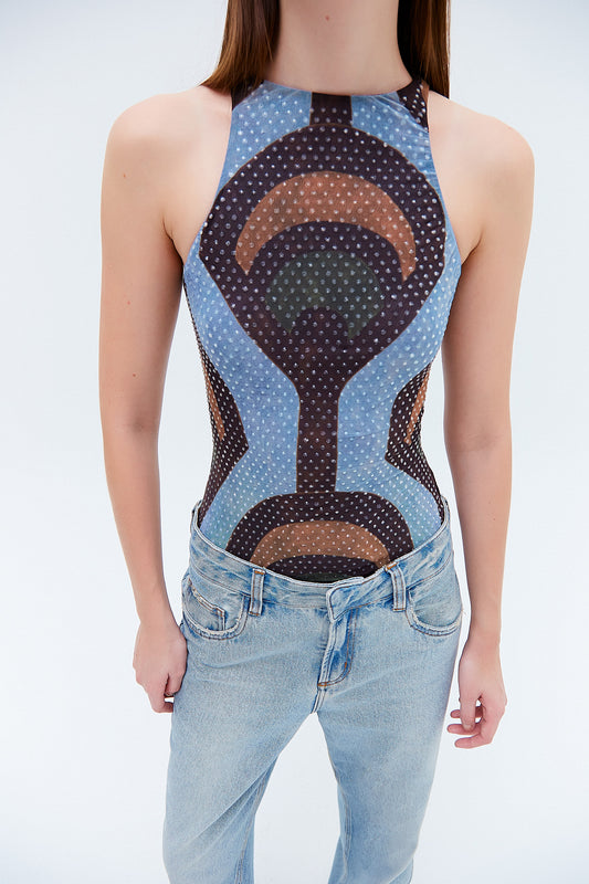 EsgotadoREGATA NADADOR TULE ESTAMPA PADRÃO AZUL PEDRAS