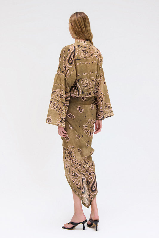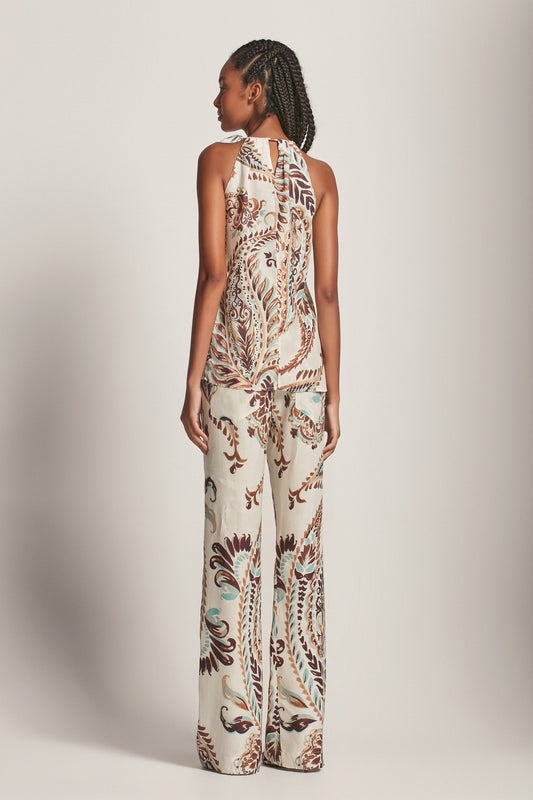 EsgotadoREGATA TRANSPASSADA LINHO ESTAMPA PAISLEY VERDE E MARROM
