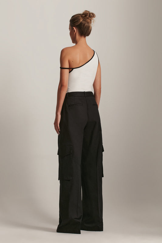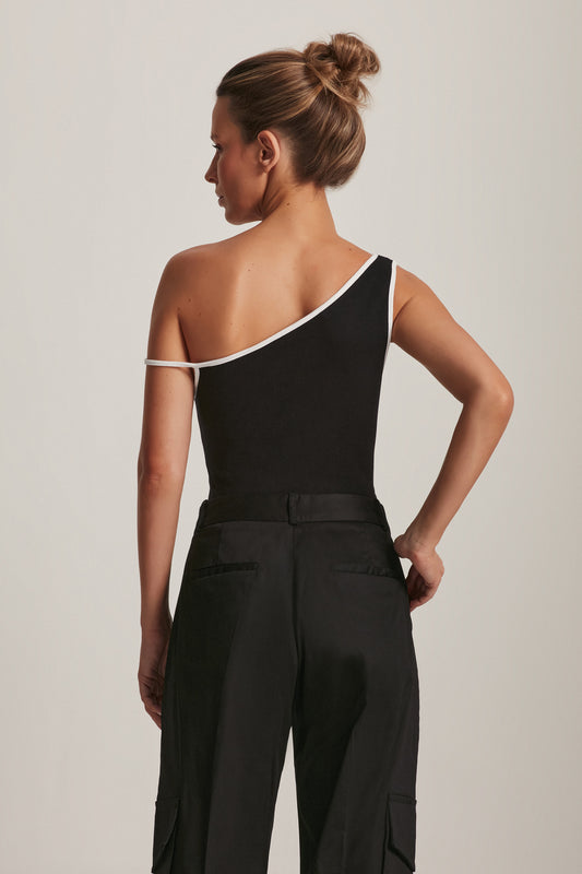 EsgotadoREGATA UM OMBRO MALHA PRETA VIÉS OFF WHITE