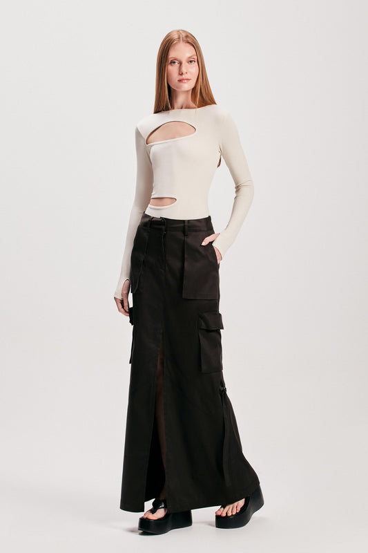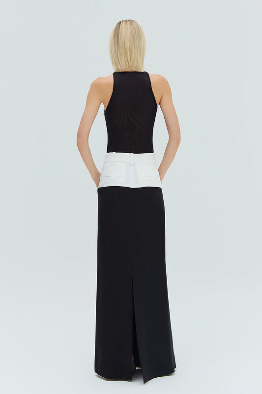 EsgotadoSAIA LONGA BICOLOR CREPE PATOU PRETA E OFF WHITE