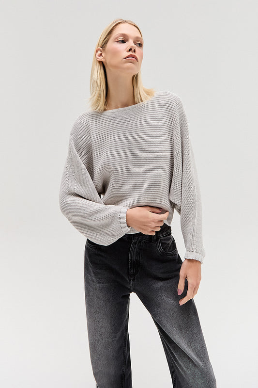 EsgotadoTRICOT DECOTE CANOA COSTAS ABERTAS CINZA CLARO