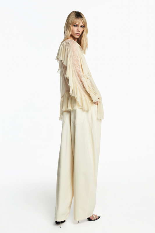 CALÇA PREGAS PERNA AMPLA SARJA MANTEIGA