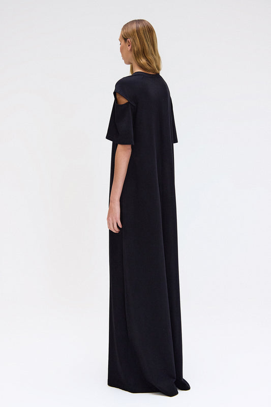 VESTIDO LONGO MANGA CURTA ABERTURA COLO E MANGA MALHA PRETA