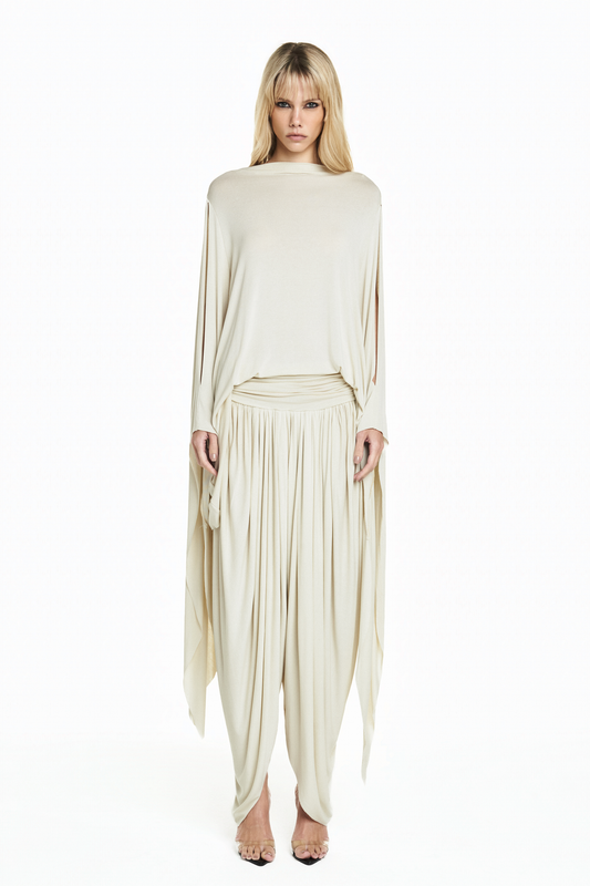 CALÇA PALA DRAPEADA PERNA AMPLA MALHA BEGE