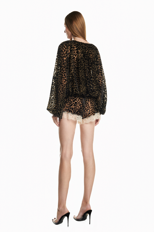 VESTIDO CURTO ALÇA DEVORÊ ONÇA COM RENDA BEGE