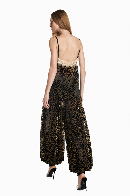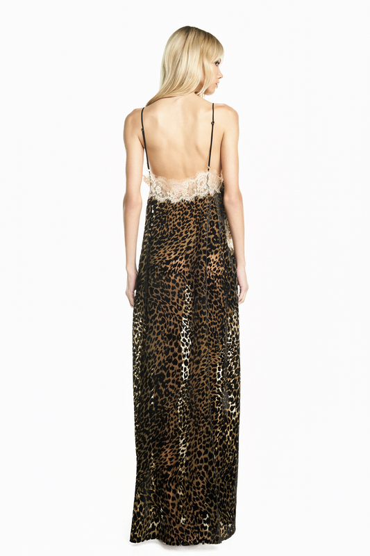 VESTIDO LONGO ALÇA DEVORÊ ONÇA COM RENDA BEGE