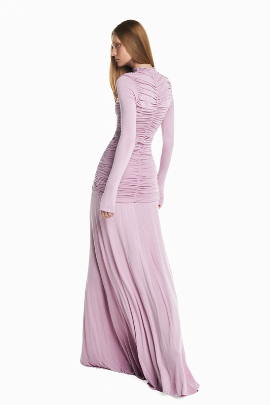 VESTIDO LONGO CORPO DRAPEADO MANGA LONGA MALHA ROSA