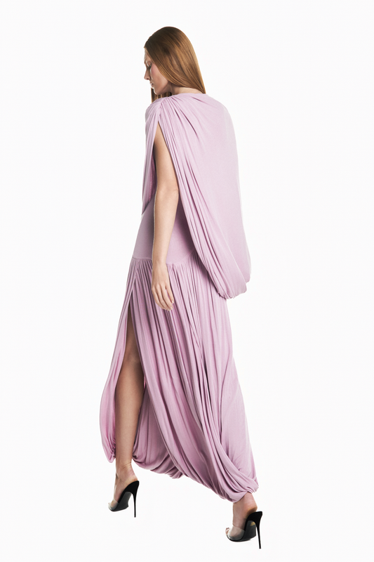 VESTIDO LONGO CAPA SOBREPOSTA SAIA TORCIDA MALHA ROSA