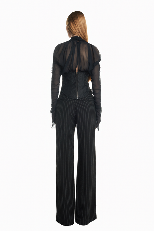 BLUSA MANGA LONGA FRENTE DRAPEADA CHIFFON COM CORSET DE JACQUARD PRETO