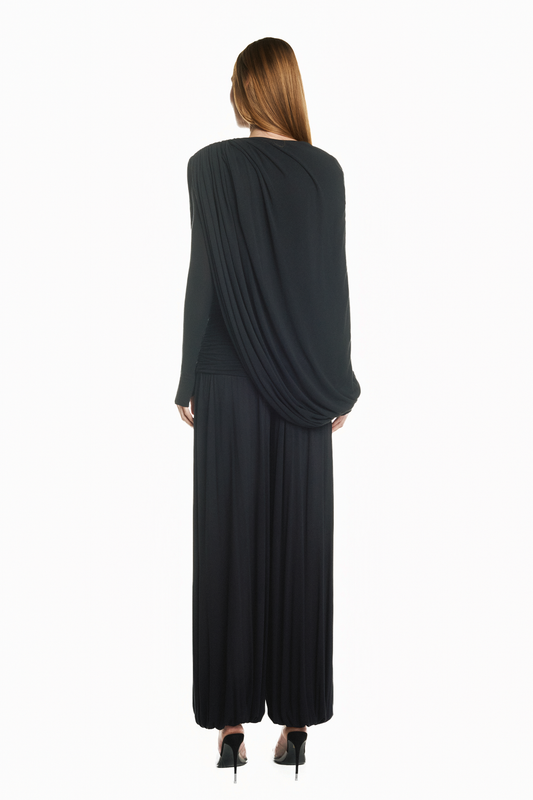 VESTIDO LONGO CAPA SOBREPOSTA SAIA TORCIDA MALHA PRETO