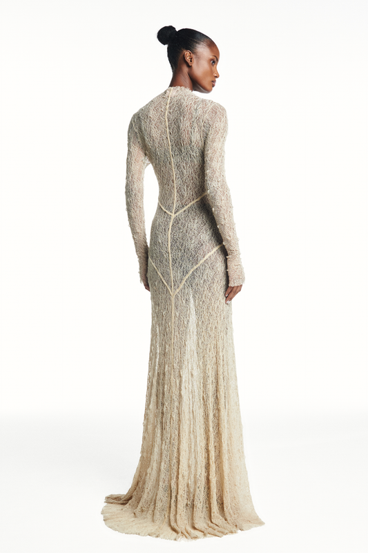 VESTIDO LONGO MANGA LONGA RECORTES RENDA BEGE