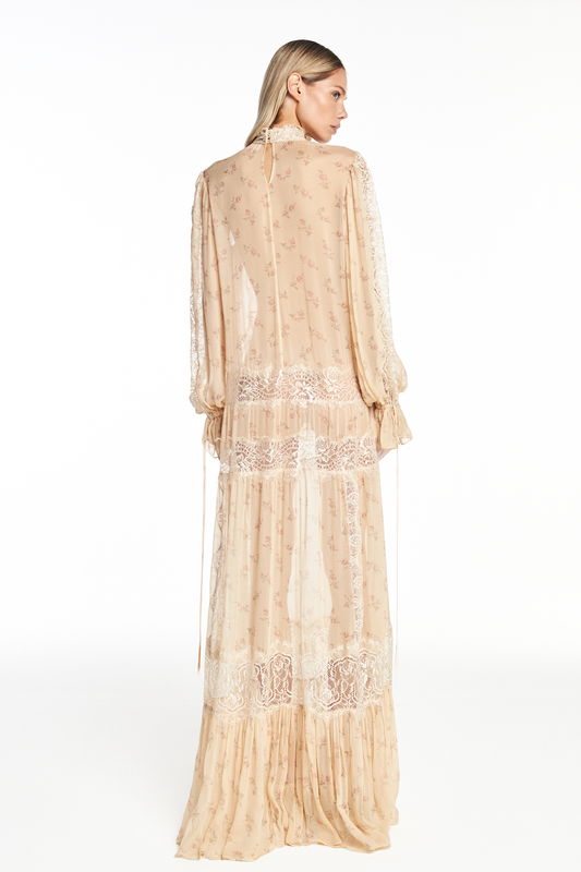 VESTIDO LONGO MANGA LONGA RECORTES RENDA BEGE