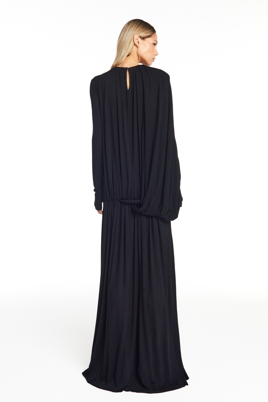 EsgotadoVESTIDO LONGO MANGA LONGA SAIA TORCIDA CORPO DRAPEADO MALHA PRETO