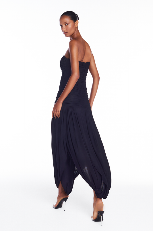 VESTIDO TOMARA QUE CAIA CORPO DRAPEADO SAIA TORCIDA MALHA PRETO