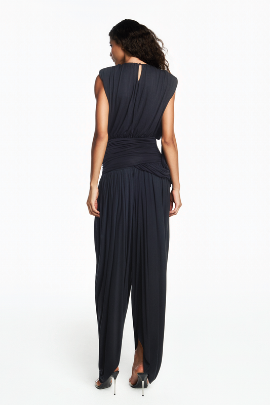 VESTIDO CURTO PALA E CORPO DRAPEADOS FAIXA LATERAL MALHA PRETA