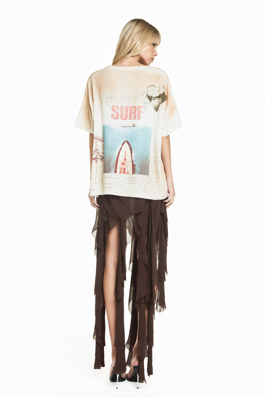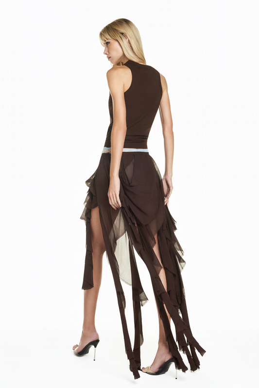 MINI SAIA BABADOS ASSIMÉTRICOS CHIFFON MARROM