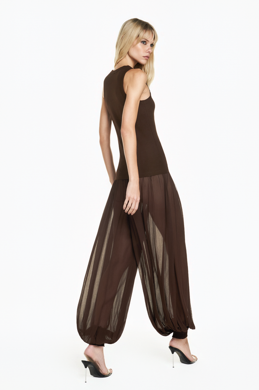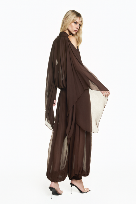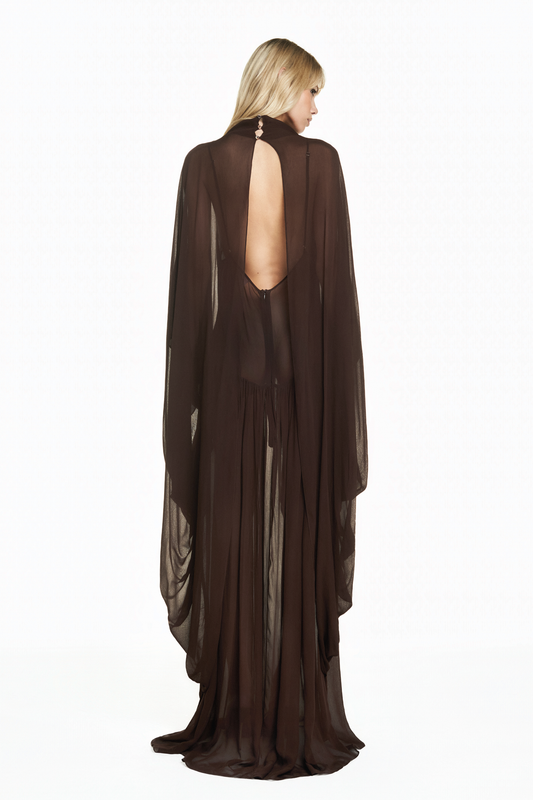 VESTIDO LONGO AMPLO CAPA CHIFFON MARROM