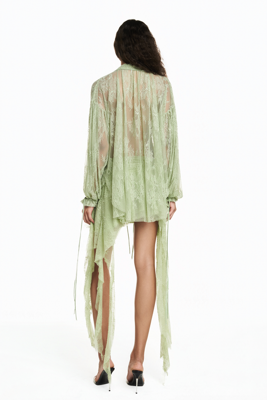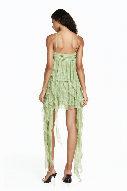 VESTIDO PALA DRAPEADA BABADOS ASSIMÉTRICOS RENDA VERDE