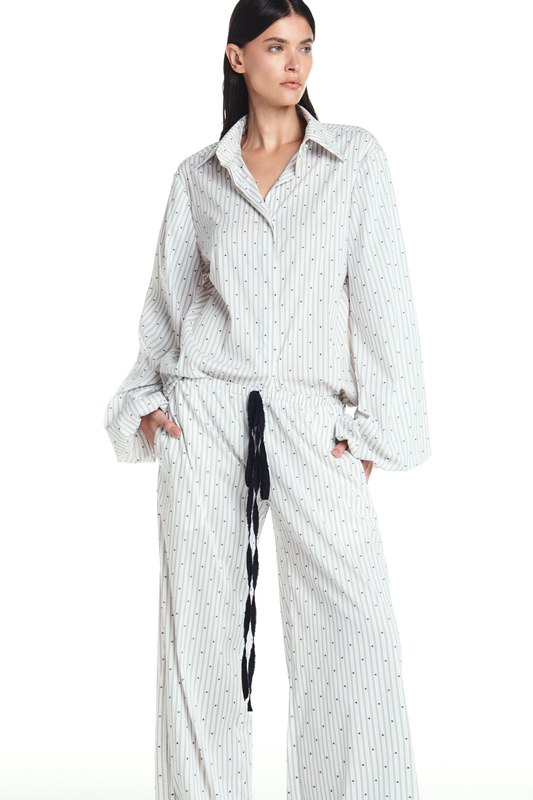 CAMISA MANGA BALONÊ TRICOLINE LISTRAS BEGE