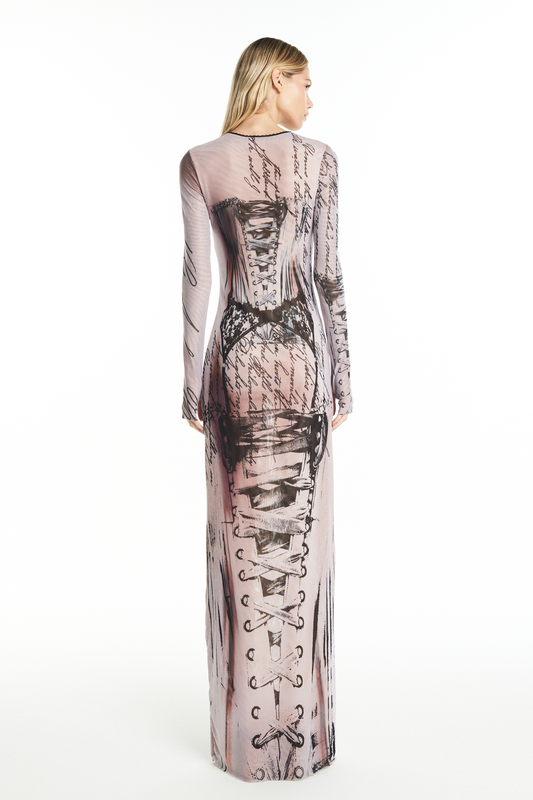 VESTIDO LONGO MANGA LONGA TULE ESTAMPA CORSET