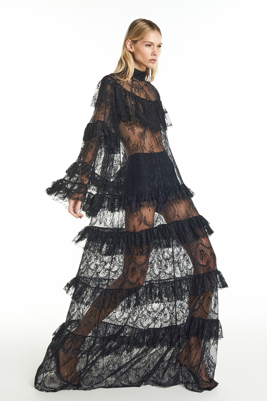 VESTIDO LONGO GOLA ALTA BABADOS RENDA PRETO