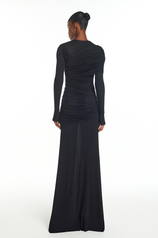 VESTIDO LONGO TRANSPASSES DECOTE ASSIMÉTRICO MANGA LONGA MALHA PRETO