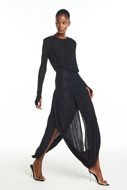 EsgotadoVESTIDO LONGO MANGA LONGA SAIA TORCIDA CORPO DRAPEADO MALHA PRETA