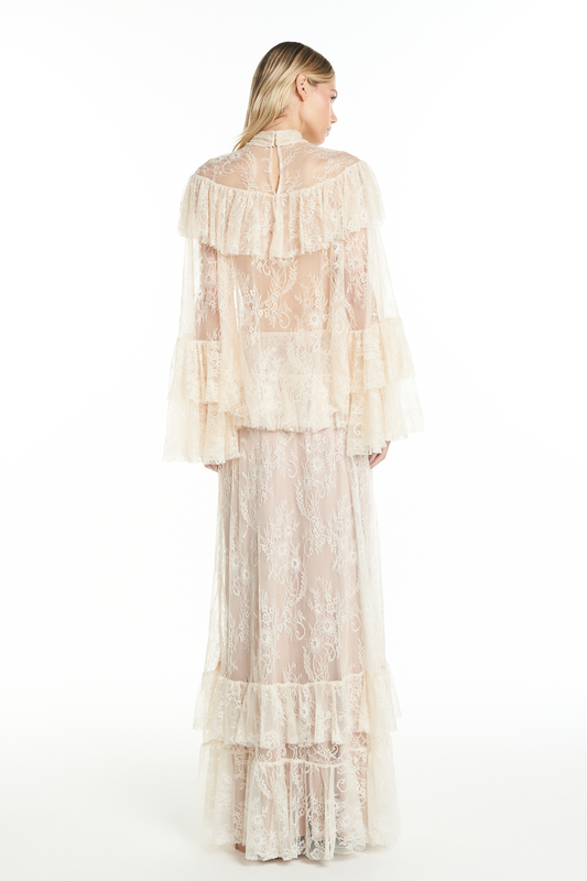 EsgotadoBLUSA GOLA ALTA BABADOS COLO E MANGAS RENDA OFF WHITE