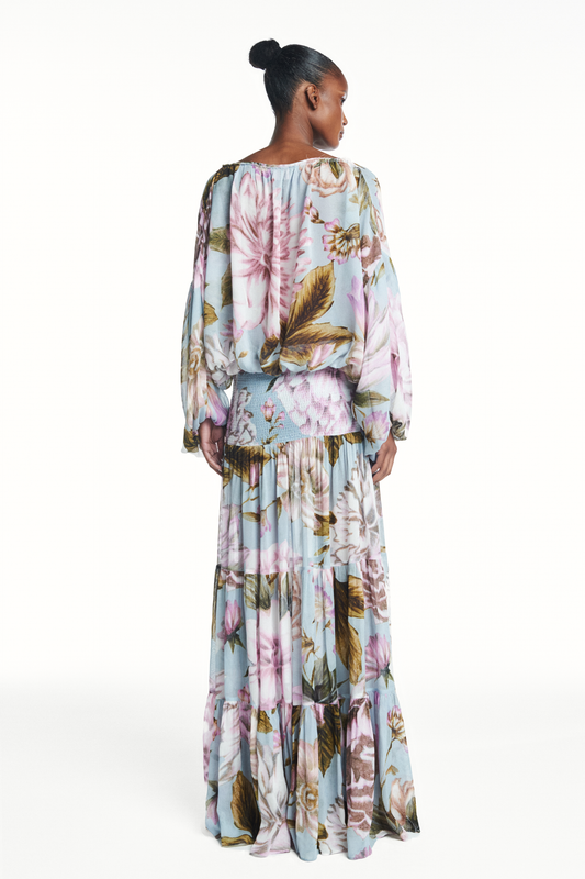 VESTIDO LONGO AMPLO CAPA GEORGETE FLORAL AZUL