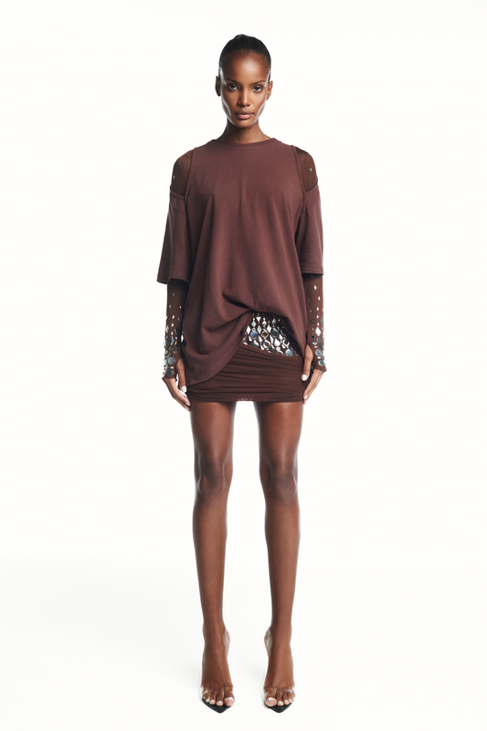 MINI SAIA DRAPEADA METAIS TULE MARROM