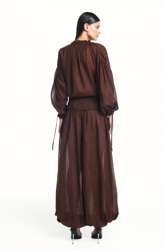 CALÇA PALA DRAPEADA ELÁSTICO BARRA ALGODÃO MARROM